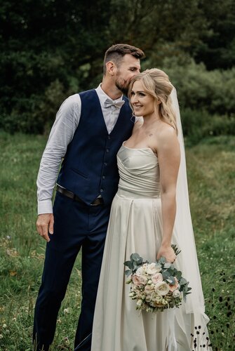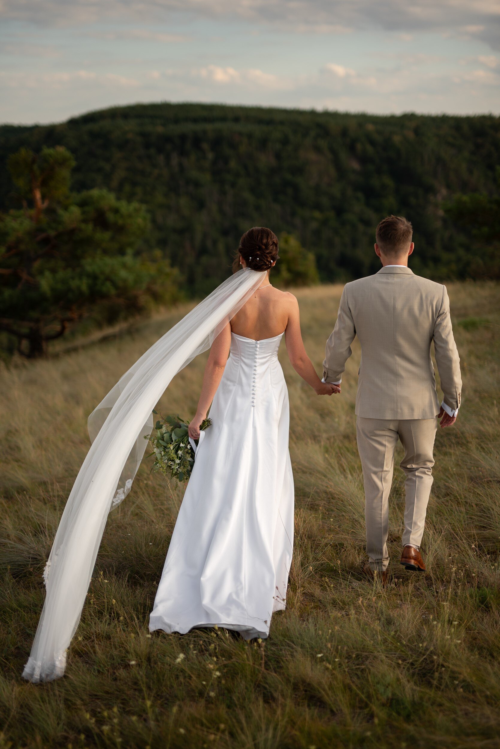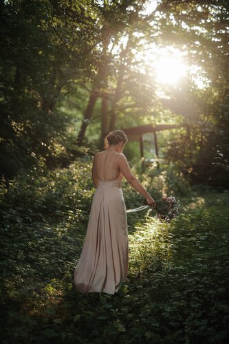 Jsem velmi drobné postavy, takže šaty na míru pro mě byly celkem jasná volba. Jsem moc ráda, že jsem při vybírání krejčovství objevila SALONč4, protože se nám podařilo vytvořit minimalistické, ale zároveň naprosto jedinečné šaty! Pod rukama skutečných profesionálů (a navíc v útulném prostředí, kam jsem se vždy těšila na zkoušku) vznikly šaty, které jsem si dala dohromady podle fotek z internetu a svých vlastních představ. Ale také vlastně vznikaly tak trochu na místě, protože na každé zkoušce jsme po konzultaci něco trochu posunuli, zapošili, přidali, ubrali… No, a třešničkou na dortu (tedy na šatech), byla nádherná výšivka, se kterou jsem přišla relativně na poslední chvíli. Díky tomu, že se toho nápadu v salonu nijak nezalekli, tak jsem na vlečce měla vyšitý opravdu unikátní příběh. Jsem si jistá, že takový ještě neměla žádná jiná nevěsta na světě!